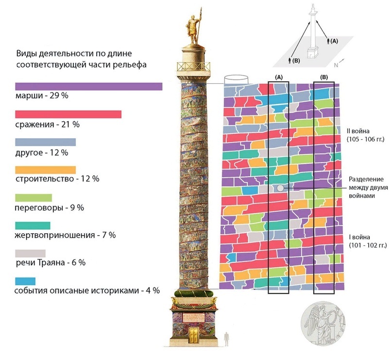 ![]() Цветовая дифференциация колонны. Маршировали больше, чем сражались ![]() #ДревнийРим #Траян Диаграмма даёт хорошее представление о соотношении основных жанровых сцен рельефа Колонны 16014 | |