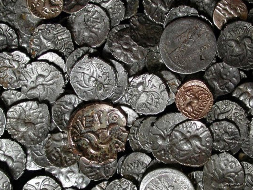 Халлатонский клад (Hallaton Hoard) обнаружен в 2001 году в Лестершире. Клад содержит более 5292 монет, как монеты железного века местного производства, так и монеты Римской республики и Империи и ранний имперский римский кавалерийский шлем. ![]() ![]() ![]() ![]() | |